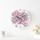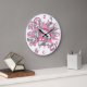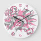 This cute volleyball wall clock features an "explosion" of varied size pink, grey and white volleyballs and pink, grey and white star shapes with overlying clock face numerals - the volleyballs' pink and grey panels are blended with a girly, floral kaleidoscopic pattern - customise with athlete's name and jersey number - by katz_d_zynes