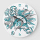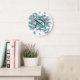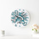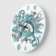 This cool girl's volleyball wall clock features an "explosion" of varied size teal, grey and white volleyballs and teal, grey and white star shapes with overlying clock face numerals - the teal and grey volleyball panels are blended with a girly, floral kaleidoscopic pattern - customise with athlete's name and jersey number - by katz_d_zynes