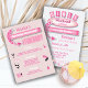 Girls Weekend getaway itinerary Invitations to fabulous Las Vegas. These invitations feature a retro sign to welcome your friends to a Birthday Party for the weekend and the back holds all the details of the fun events. You can change it to a bachelorette party to fit your needs. Light faux texture background of white, pink and blush colour palate with fun playful icons. Hand drawn illustration by McBooboo