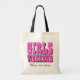 Girls weekend party tote bag | Personalised text for destination or theme. Cute for girlfriends, girls night out, womens get together reunion, ladies vacation trip or bachelorette party for wedding brides and bridesmaids. Elegant customisable text. Pink and black colour.