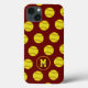 This simply designed softball themed iPhone case for girls features an angled pattern of bright yellow softballs on a customisable maroon background - customise monogram on a coordinating circle pendant - by katz_d_zynes