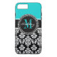 Girly Aqua Black Damask Your Monogram Name Case-Mate iPhone Case