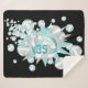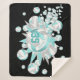 This colourful girl's volleyball themed sherpa fleece blanket features an "explosion" of varied size aqua, grey and white volleyballs and aqua, grey and white star shapes on a customisable black background - customise with athlete's name and jersey number - the aqua and grey volleyball panels are blended with a girly floral kaleidoscopic pattern for a textured appearance, and a tiny polka dots pattern overlies the aqua star - by katz_d_zynes