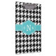 Black and white houndstooth pattern with a seafoam blue stylish quatrefoil triple monogram template. A modern and trendy gift idea for a preppy, stylish sorority girl.