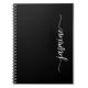 Modern, Simple, Black Monogram Name Feminine Signature Script Spiral Notebook. This minimalist plain colour design featuring your first name in a pretty hand lettered swash tail font typography white script on black colour background. Easy to personalise them. Great custom personalised girly gift for Birthday Party, Wedding, SWEET 16 Birthday party, Bridal shower, BABY shower and for anyone who loves pretty minimalist style.