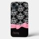 Stylish iPhone case, with a black and white damask pattern, on the top of the case and a solid black background, on the bottom. Graphics of a pretty pink ribbon and bow runs across the case between the two backgrounds. Pink script text, on the bottom, is ready to personalise. Pretty way to protect your iPhone and look stylish too, and makes a great personalised gift idea. Chose from matte or glossy finish on this great looking case.