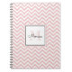 Personalised spiral notebook features a beautiful girly blush pink chevron pattern with custom name in black handwriting font and monogram in pastel red shade in white square frame.