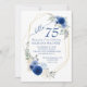 Girly chic navy blue floral 75th birthday invitations with gold frame for her in pretty blue flowers.