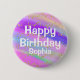 Colourful, personalised Happy Birthday button with a unicorn rainbow colour background, gold glitter sparkles confetti, and bold white writing. You can easily add the name of your choice and change the colour and font of the name using the customise option!
