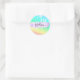 Girly and cute classic round sticker with a colourful aqua, turquoise, blue, green, yellow, pink and peach unicorn rainbow hearts sparkly background. Your custom name and monogram are written in an elegant hand lettered script with a lilac purple unicorn paint brush strokes stripe background. A perfect birthday or Christmas gift!
