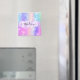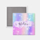 Girly and cute magnet with a colourful pink, purple, lilac, blue and green unicorn rainbow hearts sparkly background. Your custom name and monogram are written in an elegant hand lettered script with a lilac purple unicorn paint brush strokes stripe background. A perfect birthday or Christmas gift!