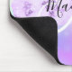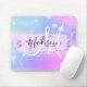 Girly and cute mouse pad with a colourful pink, purple, lilac, blue and aqua unicorn rainbow hearts sparkly background. Your custom name and monogram are written in an elegant hand lettered script with a lilac purple unicorn paint brush strokes stripe background. A perfect birthday or Christmas gift!