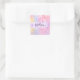 Girly and cute square sticker with a colourful pink, peach, purple, lilac and blue unicorn rainbow hearts sparkly background. Your custom name and monogram are written in an elegant hand lettered script with a lilac purple unicorn paint brush strokes stripe background. A perfect birthday or Christmas gift!
