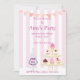 Girly Cupcakes and Candy Jar Birthday Invitation. Perfect invite for a Girl's birthday party. Design features a pink and white candy stripe background, a glass candy jar filled with pink and navy sweets complete with a candy buffet label and ribbon. A 3 tier cupcake stand with selection of delicious cupcakes and some pretty bunting! Change the wording to whatever you wish!