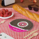 Super cute sweet doughnut design on graphic lace, brown stripes and pink background. At the bottom there's an area for custom name.