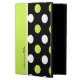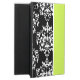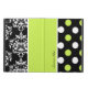 Pretty iPad Air 2 case, with built in stand and graphics of three stripes of different patterns. A black and white damask pattern, solid chartreuse, and a black with white and chartreuse polka dots. Personalise the black text to suit your needs. Makes an excellent gift idea.