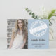 This modern photo graduation party invitation design features a white circle as a stamp with white typography that reads “class of” and the graduation year. Dusty Blue background colour and white and grey text.