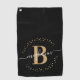 Girly, modern, trendy, elegant, black and gold monogram initial name script custom personalised monogrammed golf towel. Featuring a monogram initial and a girly name script in a hand lettered calligraphy swash tail font and dotted circle frame around your monogram. Great feminine girly gift for mother, birthday, sister, wedding, bridal shower, sweet 16 birthday party and baby shower and for anyone who loves pretty modern style thing.