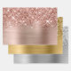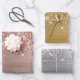 Glam style wrapping paper sheets for the holidays in rose gold, golden, and silver or silvery grey.