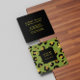 Modern, girly animalier networking card featuring digital image of leopard print in Green, black and glitter gold . Black stripe overlay. Great for beauty, fashion , entertainment and event professionals.