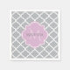 Girly light grey quatrefoil patterned paper napkins with a scalloped badge in a pinkish lavender that you can personalise by adding your name and monogrammed initial to. This is part of the Harbour Mist Grey and Lavender Pink Spring Collection.