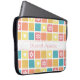 A girly square pattern 15 inch Laptop Sleeve with modern style rounded corners in pretty spring colours, decorated with cute hearts and retro daisy flowers. Personalise by adding the name of any girlie girl to this retro mod case in shades of coral pink goldenrod yellow, and turquoise blue. Original Art copyright of ©OhSoGirly