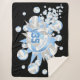 This fun girl's volleyball themed sherpa fleece blanket features an "explosion" of varied size light blue, grey and white volleyballs and blue, grey and white star shapes on a customisable black background - customise with athlete's name and jersey number - the blue and grey volleyball panels are blended with a girly floral kaleidoscopic pattern for a textured appearance - by katz_d_zynes
