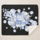 This girly volleyball themed sherpa fleece blanket features an "explosion" of varied size light blue and white volleyballs and blue, grey and white star shapes on a customisable black background - customise with athlete's name and jersey number - the blue and grey volleyball panels are blended with a girly floral kaleidoscopic pattern for a textured appearance, and a tiny white polka dots pattern overlies the blue star - by katz_d_zynes