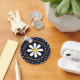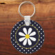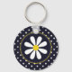 A circle keychain with a girly retro mod daisy flower with a yellow centre against a navy blue background, and a trendy blue and white polka dot pattern on the outside.