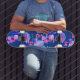 Colorful purple, navy, and pink abstract modern art skateboard with personalized name in casual hand-lettered white typography script.