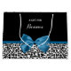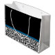 Personalise by adding the name of your teen girl to this trendy black and white leopard print pattern large size gift bag with a stylish classic cobalt blue ribbon tied into a cute girly bow. Flat printed image, not actual ribbon.
