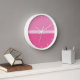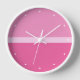 This trendy clock features a colorblock design in varying ombre gradients of hot pink, medium pink and blush pink with white dots for numbers.