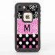Girly black LifeProof FRĒ® iPhone 7 case with a black and white damask pattern, on top, a pink and white floral pattern, in the middle, and a white and pink on black polka dot pattern, across the bottom. Personalise the black one letter monogram, to suit your needs. Chose case style and type you want before ordering.