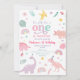 This adorable birthday invitation features hand drawn dinosaurs, rainbows and leaves in pastel colours.