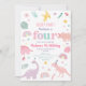 This adorable birthday invitation features hand drawn dinosaurs, rainbows and leaves in pastel colours.