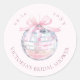 Girly bridal shower round sticker featuring a shiny disco ball with a light pink bow and elegant fonts in which all your personalised information is written. You can find matching products from this collection in our store.