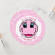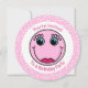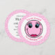 Cute girl's birthday party invitation features a pink lady emoji face, with blue eyes, long eyelashes and pink lips, surrounded by a pink and white polka dot border. Front text reads "You're Invited To a Birthday Party". Back of card has party details to personalise.