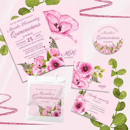 Congratulations on your Quinceñera and thank you for stopping by my store. This design is Part of the Pink Poppies Collection, which is hosts additional special events stationary including weddings, bridal showers, baby showers; as well as party supplies and decorations with matching designs.