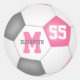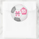 These cute and sporty soccer 3 inch round stickers for girls feature a simple soccer ball graphic with pink, grey and white panels - customise with the athlete's name, monogram and jersey number - by katz_d_zynes