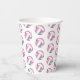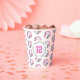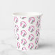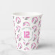 These volleyball themed birthday party paper cups feature multiple small stylised pink, grey & white volleyballs arranged in a simple drop pattern - text on a white circle graphic can be customised, currently the number 12 to represent a child's age encircled by the words, "Happy birthday" - by katz_d_zynes