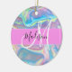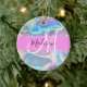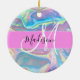 Girly pink, peach and aqua holographic iridescent monogram name and initial ceramic ornament. Your custom name and monogram are written in an elegant hand lettered script with a pink background. A perfect birthday or Christmas gift!