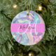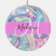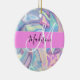 Girly pink, aqua and turquoise holographic iridescent monogram name and initial ceramic ornament. Your custom name and monogram are written in an elegant hand lettered script with a pink background. A perfect birthday or Christmas gift!