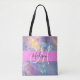 Girly pink, peach and aqua holographic iridescent monogram name and initial tote bag. Your custom name and monogram are written in an elegant hand lettered script with a pink background. A perfect birthday or Christmas gift!