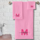 Personalised Girly Pink Modern Script Name Monogram Bath Towel Set. Add a cheerful and girly vibe to your bathroom with this stylish towel set, perfect for anyone who loves fun and feminine designs. Featuring a bright happy pink background, each towel in the set—a bath towel, hand towel, and washcloth—displays a bold magenta hot pink initial paired with a sleek black script name monogram in the bottom right corner. This vibrant and playful set makes a fabulous gift for sorority sisters, a perfect addition to a sorority house, or a thoughtful present for bridesmaids. It's also a great choice for a college student decorating a dorm room or a sweet keepsake for your child moving out for the first time. Whether for everyday use or as a charming accessory, this monogrammed towel set brings personality and flair to any space.