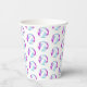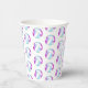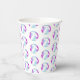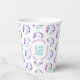 These volleyball themed birthday party paper cups feature multiple small stylised pink purple / blue / gradient with white volleyballs arranged in a simple drop pattern - text on a white circle graphic can be customised, currently the number 12 to represent a child's age encircled by the words, "Happy birthday" - by katz_d_zynes