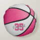 This personalised girls' basketball pillow features the realistic image of a basketball that has alternating pink and white recolored panels - personalise with player name in an "autograph" style font overlying the athlete's jersey number - by katz_d_zynes