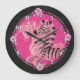 Cute, Girly Pink Zebras by artist Angela Flemming, painted in Fashion Pink and Black Colours. A circular design; the outer border is black, embellished on the inner edge with pink pearls, with four roses--one on top, one on bottom, one on left and one on right . The main part of the painting has a hot pink background, with a pair of prancing zebras of different shades of pink. The zebra in front is of a slightly deeper shade of pink, with black stripes; the one behind is a paler pink, with warm bright pink stripes. The zebras are very cute, with friendly smiles, but also very artistic. This is a cute, girly and elegant wall clock that is suitable for little girls, tweens, teens and ladies!