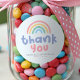 Cute and girly birthday favor sticker for a girl’s summer splash or toddler pool party. Featuring a pastel pink whimsical rainbow. Perfect for girls’ birthday tableware, two cool party decor, and cute coordinated splash party celebrations.