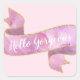 Girly and pretty blush pink square sticker featuring the words "Hello Gorgeous" in an elegant white script, with a lilac purple ribbon banner background and a gold glitter sparkle outline.