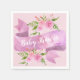 Girly and pretty blush pink napkins featuring the words "Baby Shower" in an elegant white script, with a lilac purple ribbon banner background. Two beautiful spring watercolor floral arrangements with pink roses and greenery complete the design.